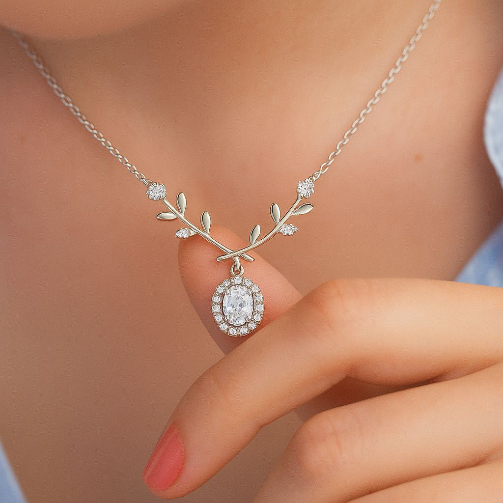 The necklace features a graceful branch motif that gently curves along the neckline, adorned with sparkling zircon stones that glimmer like delicate blossoms catching the light. From its center hangs an oval halo pendant, adding an eye-catching focal point that enhances the necklace’s refined, feminine aesthetic.